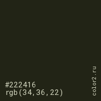 Цвет #222416 в цветовой модели RGB обозначается тремя октетами (34, 36, 22) в десятичном формате и #222416 в шестнадцатиричном (hex) формате, которые являются интенсивностью красного 34 (hex 22), интенсивность зелёного 36 (hex 24) и интенсивность синего 22 (hex 16).