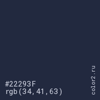 Цвет #22293F в цветовой модели RGB обозначается тремя октетами (34, 41, 63) в десятичном формате и #22293F в шестнадцатиричном (hex) формате, которые являются интенсивностью красного 34 (hex 22), интенсивность зелёного 41 (hex 29) и интенсивность синего 63 (hex 3F).