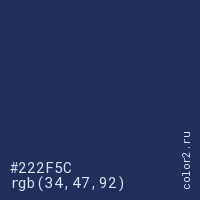 Цвет #222F5C в цветовой модели RGB обозначается тремя октетами (34, 47, 92) в десятичном формате и #222F5C в шестнадцатиричном (hex) формате, которые являются интенсивностью красного 34 (hex 22), интенсивность зелёного 47 (hex 2F) и интенсивность синего 92 (hex 5C).