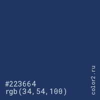 Цвет #223664 в цветовой модели RGB обозначается тремя октетами (34, 54, 100) в десятичном формате и #223664 в шестнадцатиричном (hex) формате, которые являются интенсивностью красного 34 (hex 22), интенсивность зелёного 54 (hex 36) и интенсивность синего 100 (hex 64).