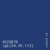 Цвет #223B70 в цветовой модели RGB обозначается тремя октетами (34, 59, 112) в десятичном формате и #223B70 в шестнадцатиричном (hex) формате, которые являются интенсивностью красного 34 (hex 22), интенсивность зелёного 59 (hex 3B) и интенсивность синего 112 (hex 70).