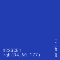 Цвет #223CB1 в цветовой модели RGB обозначается тремя октетами (34, 60, 177) в десятичном формате и #223CB1 в шестнадцатиричном (hex) формате, которые являются интенсивностью красного 34 (hex 22), интенсивность зелёного 60 (hex 3C) и интенсивность синего 177 (hex B1).