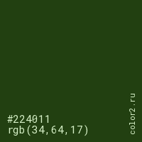 Цвет #224011 в цветовой модели RGB обозначается тремя октетами (34, 64, 17) в десятичном формате и #224011 в шестнадцатиричном (hex) формате, которые являются интенсивностью красного 34 (hex 22), интенсивность зелёного 64 (hex 40) и интенсивность синего 17 (hex 11).