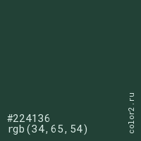 Цвет #224136 в цветовой модели RGB обозначается тремя октетами (34, 65, 54) в десятичном формате и #224136 в шестнадцатиричном (hex) формате, которые являются интенсивностью красного 34 (hex 22), интенсивность зелёного 65 (hex 41) и интенсивность синего 54 (hex 36).