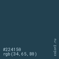 Цвет #224150 в цветовой модели RGB обозначается тремя октетами (34, 65, 80) в десятичном формате и #224150 в шестнадцатиричном (hex) формате, которые являются интенсивностью красного 34 (hex 22), интенсивность зелёного 65 (hex 41) и интенсивность синего 80 (hex 50).