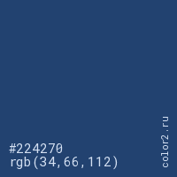 Цвет #224270 в цветовой модели RGB обозначается тремя октетами (34, 66, 112) в десятичном формате и #224270 в шестнадцатиричном (hex) формате, которые являются интенсивностью красного 34 (hex 22), интенсивность зелёного 66 (hex 42) и интенсивность синего 112 (hex 70).