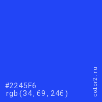 Цвет #2245F6 в цветовой модели RGB обозначается тремя октетами (34, 69, 246) в десятичном формате и #2245F6 в шестнадцатиричном (hex) формате, которые являются интенсивностью красного 34 (hex 22), интенсивность зелёного 69 (hex 45) и интенсивность синего 246 (hex F6).