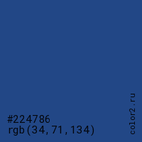 Цвет #224786 в цветовой модели RGB обозначается тремя октетами (34, 71, 134) в десятичном формате и #224786 в шестнадцатиричном (hex) формате, которые являются интенсивностью красного 34 (hex 22), интенсивность зелёного 71 (hex 47) и интенсивность синего 134 (hex 86).