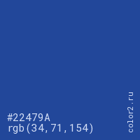 Цвет #22479A в цветовой модели RGB обозначается тремя октетами (34, 71, 154) в десятичном формате и #22479A в шестнадцатиричном (hex) формате, которые являются интенсивностью красного 34 (hex 22), интенсивность зелёного 71 (hex 47) и интенсивность синего 154 (hex 9A).