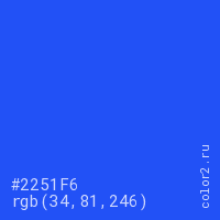 Цвет #2251F6 в цветовой модели RGB обозначается тремя октетами (34, 81, 246) в десятичном формате и #2251F6 в шестнадцатиричном (hex) формате, которые являются интенсивностью красного 34 (hex 22), интенсивность зелёного 81 (hex 51) и интенсивность синего 246 (hex F6).