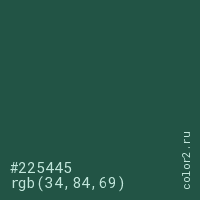 Цвет #225445 в цветовой модели RGB обозначается тремя октетами (34, 84, 69) в десятичном формате и #225445 в шестнадцатиричном (hex) формате, которые являются интенсивностью красного 34 (hex 22), интенсивность зелёного 84 (hex 54) и интенсивность синего 69 (hex 45).