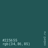 Цвет #225655 в цветовой модели RGB обозначается тремя октетами (34, 86, 85) в десятичном формате и #225655 в шестнадцатиричном (hex) формате, которые являются интенсивностью красного 34 (hex 22), интенсивность зелёного 86 (hex 56) и интенсивность синего 85 (hex 55).
