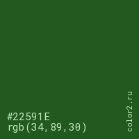 Цвет #22591E в цветовой модели RGB обозначается тремя октетами (34, 89, 30) в десятичном формате и #22591E в шестнадцатиричном (hex) формате, которые являются интенсивностью красного 34 (hex 22), интенсивность зелёного 89 (hex 59) и интенсивность синего 30 (hex 1E).