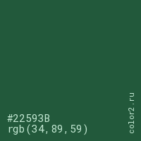 Цвет #22593B в цветовой модели RGB обозначается тремя октетами (34, 89, 59) в десятичном формате и #22593B в шестнадцатиричном (hex) формате, которые являются интенсивностью красного 34 (hex 22), интенсивность зелёного 89 (hex 59) и интенсивность синего 59 (hex 3B).