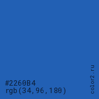 Цвет #2260B4 в цветовой модели RGB обозначается тремя октетами (34, 96, 180) в десятичном формате и #2260B4 в шестнадцатиричном (hex) формате, которые являются интенсивностью красного 34 (hex 22), интенсивность зелёного 96 (hex 60) и интенсивность синего 180 (hex B4).