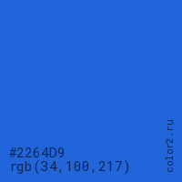 Цвет #2264D9 в цветовой модели RGB обозначается тремя октетами (34, 100, 217) в десятичном формате и #2264D9 в шестнадцатиричном (hex) формате, которые являются интенсивностью красного 34 (hex 22), интенсивность зелёного 100 (hex 64) и интенсивность синего 217 (hex D9).