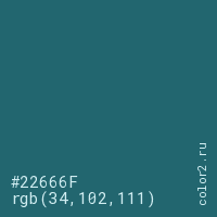 Цвет #22666F в цветовой модели RGB обозначается тремя октетами (34, 102, 111) в десятичном формате и #22666F в шестнадцатиричном (hex) формате, которые являются интенсивностью красного 34 (hex 22), интенсивность зелёного 102 (hex 66) и интенсивность синего 111 (hex 6F).