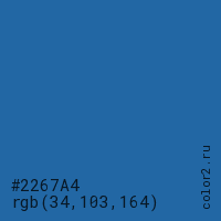 Цвет #2267A4 в цветовой модели RGB обозначается тремя октетами (34, 103, 164) в десятичном формате и #2267A4 в шестнадцатиричном (hex) формате, которые являются интенсивностью красного 34 (hex 22), интенсивность зелёного 103 (hex 67) и интенсивность синего 164 (hex A4).