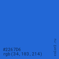 Цвет #2267D6 в цветовой модели RGB обозначается тремя октетами (34, 103, 214) в десятичном формате и #2267D6 в шестнадцатиричном (hex) формате, которые являются интенсивностью красного 34 (hex 22), интенсивность зелёного 103 (hex 67) и интенсивность синего 214 (hex D6).