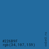 Цвет #226B9F в цветовой модели RGB обозначается тремя октетами (34, 107, 159) в десятичном формате и #226B9F в шестнадцатиричном (hex) формате, которые являются интенсивностью красного 34 (hex 22), интенсивность зелёного 107 (hex 6B) и интенсивность синего 159 (hex 9F).