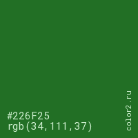 Цвет #226F25 в цветовой модели RGB обозначается тремя октетами (34, 111, 37) в десятичном формате и #226F25 в шестнадцатиричном (hex) формате, которые являются интенсивностью красного 34 (hex 22), интенсивность зелёного 111 (hex 6F) и интенсивность синего 37 (hex 25).