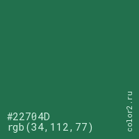 Цвет #22704D в цветовой модели RGB обозначается тремя октетами (34, 112, 77) в десятичном формате и #22704D в шестнадцатиричном (hex) формате, которые являются интенсивностью красного 34 (hex 22), интенсивность зелёного 112 (hex 70) и интенсивность синего 77 (hex 4D).