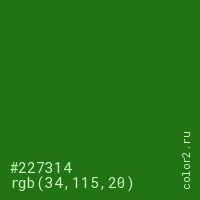 Цвет #227314 в цветовой модели RGB обозначается тремя октетами (34, 115, 20) в десятичном формате и #227314 в шестнадцатиричном (hex) формате, которые являются интенсивностью красного 34 (hex 22), интенсивность зелёного 115 (hex 73) и интенсивность синего 20 (hex 14).