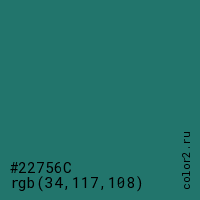 Цвет #22756C в цветовой модели RGB обозначается тремя октетами (34, 117, 108) в десятичном формате и #22756C в шестнадцатиричном (hex) формате, которые являются интенсивностью красного 34 (hex 22), интенсивность зелёного 117 (hex 75) и интенсивность синего 108 (hex 6C).