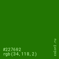 Цвет #227602 в цветовой модели RGB обозначается тремя октетами (34, 118, 2) в десятичном формате и #227602 в шестнадцатиричном (hex) формате, которые являются интенсивностью красного 34 (hex 22), интенсивность зелёного 118 (hex 76) и интенсивность синего 2 (hex 02).