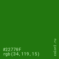 Цвет #22770F в цветовой модели RGB обозначается тремя октетами (34, 119, 15) в десятичном формате и #22770F в шестнадцатиричном (hex) формате, которые являются интенсивностью красного 34 (hex 22), интенсивность зелёного 119 (hex 77) и интенсивность синего 15 (hex 0F).