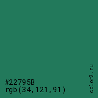 Цвет #22795B в цветовой модели RGB обозначается тремя октетами (34, 121, 91) в десятичном формате и #22795B в шестнадцатиричном (hex) формате, которые являются интенсивностью красного 34 (hex 22), интенсивность зелёного 121 (hex 79) и интенсивность синего 91 (hex 5B).