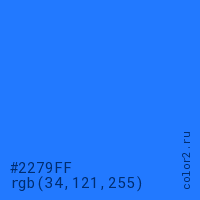 Цвет #2279FF в цветовой модели RGB обозначается тремя октетами (34, 121, 255) в десятичном формате и #2279FF в шестнадцатиричном (hex) формате, которые являются интенсивностью красного 34 (hex 22), интенсивность зелёного 121 (hex 79) и интенсивность синего 255 (hex FF).