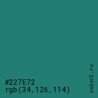 Цвет #227E72 в цветовой модели RGB обозначается тремя октетами (34, 126, 114) в десятичном формате и #227E72 в шестнадцатиричном (hex) формате, которые являются интенсивностью красного 34 (hex 22), интенсивность зелёного 126 (hex 7E) и интенсивность синего 114 (hex 72).