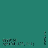 Цвет #22816F в цветовой модели RGB обозначается тремя октетами (34, 129, 111) в десятичном формате и #22816F в шестнадцатиричном (hex) формате, которые являются интенсивностью красного 34 (hex 22), интенсивность зелёного 129 (hex 81) и интенсивность синего 111 (hex 6F).