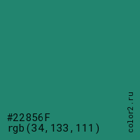 Цвет #22856F в цветовой модели RGB обозначается тремя октетами (34, 133, 111) в десятичном формате и #22856F в шестнадцатиричном (hex) формате, которые являются интенсивностью красного 34 (hex 22), интенсивность зелёного 133 (hex 85) и интенсивность синего 111 (hex 6F).