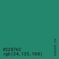Цвет #22876C в цветовой модели RGB обозначается тремя октетами (34, 135, 108) в десятичном формате и #22876C в шестнадцатиричном (hex) формате, которые являются интенсивностью красного 34 (hex 22), интенсивность зелёного 135 (hex 87) и интенсивность синего 108 (hex 6C).