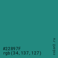 Цвет #22897F в цветовой модели RGB обозначается тремя октетами (34, 137, 127) в десятичном формате и #22897F в шестнадцатиричном (hex) формате, которые являются интенсивностью красного 34 (hex 22), интенсивность зелёного 137 (hex 89) и интенсивность синего 127 (hex 7F).