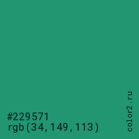 Цвет #229571 в цветовой модели RGB обозначается тремя октетами (34, 149, 113) в десятичном формате и #229571 в шестнадцатиричном (hex) формате, которые являются интенсивностью красного 34 (hex 22), интенсивность зелёного 149 (hex 95) и интенсивность синего 113 (hex 71).