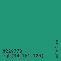 Цвет #229778 в цветовой модели RGB обозначается тремя октетами (34, 151, 120) в десятичном формате и #229778 в шестнадцатиричном (hex) формате, которые являются интенсивностью красного 34 (hex 22), интенсивность зелёного 151 (hex 97) и интенсивность синего 120 (hex 78).