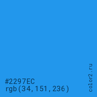 Цвет #2297EC в цветовой модели RGB обозначается тремя октетами (34, 151, 236) в десятичном формате и #2297EC в шестнадцатиричном (hex) формате, которые являются интенсивностью красного 34 (hex 22), интенсивность зелёного 151 (hex 97) и интенсивность синего 236 (hex EC).