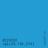 Цвет #229CD2 в цветовой модели RGB обозначается тремя октетами (34, 156, 210) в десятичном формате и #229CD2 в шестнадцатиричном (hex) формате, которые являются интенсивностью красного 34 (hex 22), интенсивность зелёного 156 (hex 9C) и интенсивность синего 210 (hex D2).
