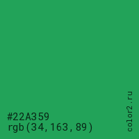 Цвет #22A359 в цветовой модели RGB обозначается тремя октетами (34, 163, 89) в десятичном формате и #22A359 в шестнадцатиричном (hex) формате, которые являются интенсивностью красного 34 (hex 22), интенсивность зелёного 163 (hex A3) и интенсивность синего 89 (hex 59).