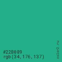 Цвет #22B089 в цветовой модели RGB обозначается тремя октетами (34, 176, 137) в десятичном формате и #22B089 в шестнадцатиричном (hex) формате, которые являются интенсивностью красного 34 (hex 22), интенсивность зелёного 176 (hex B0) и интенсивность синего 137 (hex 89).