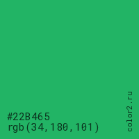 Цвет #22B465 в цветовой модели RGB обозначается тремя октетами (34, 180, 101) в десятичном формате и #22B465 в шестнадцатиричном (hex) формате, которые являются интенсивностью красного 34 (hex 22), интенсивность зелёного 180 (hex B4) и интенсивность синего 101 (hex 65).