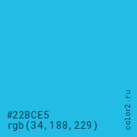 Цвет #22BCE5 в цветовой модели RGB обозначается тремя октетами (34, 188, 229) в десятичном формате и #22BCE5 в шестнадцатиричном (hex) формате, которые являются интенсивностью красного 34 (hex 22), интенсивность зелёного 188 (hex BC) и интенсивность синего 229 (hex E5).