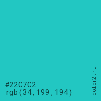 Цвет #22C7C2 в цветовой модели RGB обозначается тремя октетами (34, 199, 194) в десятичном формате и #22C7C2 в шестнадцатиричном (hex) формате, которые являются интенсивностью красного 34 (hex 22), интенсивность зелёного 199 (hex C7) и интенсивность синего 194 (hex C2).
