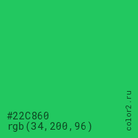 Цвет #22C860 в цветовой модели RGB обозначается тремя октетами (34, 200, 96) в десятичном формате и #22C860 в шестнадцатиричном (hex) формате, которые являются интенсивностью красного 34 (hex 22), интенсивность зелёного 200 (hex C8) и интенсивность синего 96 (hex 60).
