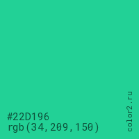 Цвет #22D196 в цветовой модели RGB обозначается тремя октетами (34, 209, 150) в десятичном формате и #22D196 в шестнадцатиричном (hex) формате, которые являются интенсивностью красного 34 (hex 22), интенсивность зелёного 209 (hex D1) и интенсивность синего 150 (hex 96).