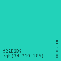 Цвет #22D2B9 в цветовой модели RGB обозначается тремя октетами (34, 210, 185) в десятичном формате и #22D2B9 в шестнадцатиричном (hex) формате, которые являются интенсивностью красного 34 (hex 22), интенсивность зелёного 210 (hex D2) и интенсивность синего 185 (hex B9).