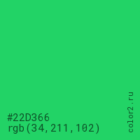 Цвет #22D366 в цветовой модели RGB обозначается тремя октетами (34, 211, 102) в десятичном формате и #22D366 в шестнадцатиричном (hex) формате, которые являются интенсивностью красного 34 (hex 22), интенсивность зелёного 211 (hex D3) и интенсивность синего 102 (hex 66).
